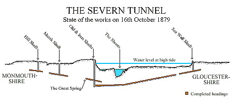 By  the 16th of October 1879, the length of the heading under the river had progressed so well that just 500 feet intervened between the headings from the Old Shaft on the Monmouthshire side of the river and the Sea Wall Shaft on the Gloucestershire side. In addition, the workings from the new Hill and Marsh Shafts had reached an advanced stage. None of these headings up to this time had given any large amounts of water, but